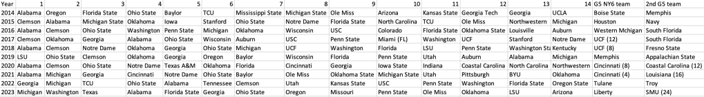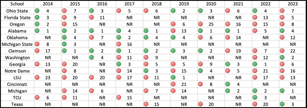 What I do not know is how the format of the 14-team playoff would be, or what the representation is. I imagine that Notre Dame is an impactful entity in this process as an independent because Notre Dame has finished in the CFP rankings inside the top 14 during 5 of the 10 years so far. But that shouldn’t mean they are entitled to a playoff spot. Teams that made the playoff multiple times did so because their teams were good enough to accomplish it. Same goes for the Irish, as they made it twice. Notre Dame’s respective finishes are NR, 8, NR, 14, 3, 15, 4, 5, 21, 16 (in the last 10 years), so if there were 12 teams, they would have made the playoff four times instead of the two they did qualify for. The graphic below has the final ranking for each of the 15 schools that made the 4-team CFP.