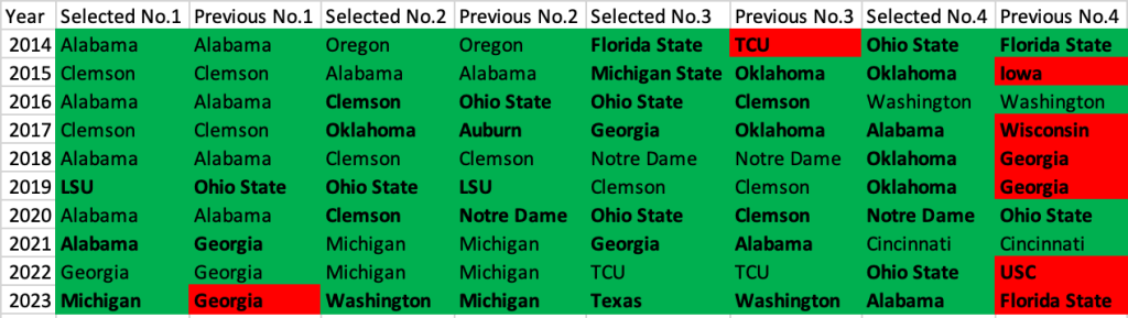 The last thing I want to share is about how the field gets impacted during the final hurdle. In each of the 10 years of the 4-team CFP, not once did every one of the four teams stay in their spot from the week before. The table below indicates the switches in bold, and Green/Red indicates who made/missed the playoff as a result of that change.